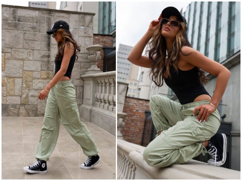 - S pasovým pásem: Přidání pasu do padákových kalhot pomůže definovat siluetu a dodá jí ženštější vzhled. Každý producent odzieży chce teraz mieć takie spodnie w swojej ofercie.
