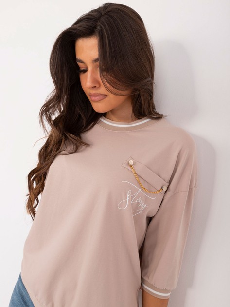 Béžová dámská ležérní halenka s 3/4 rukávy dostupná na webových stránkách velkoobchodu šatů je vyrobena z vysoce kvalitních materiálů, díky nimž je nejen elegantní, ale také odolná. Tento výrobek se vyznačuje promyšleným střihem, který zaručuje dokonalé přizpůsobení postavě.