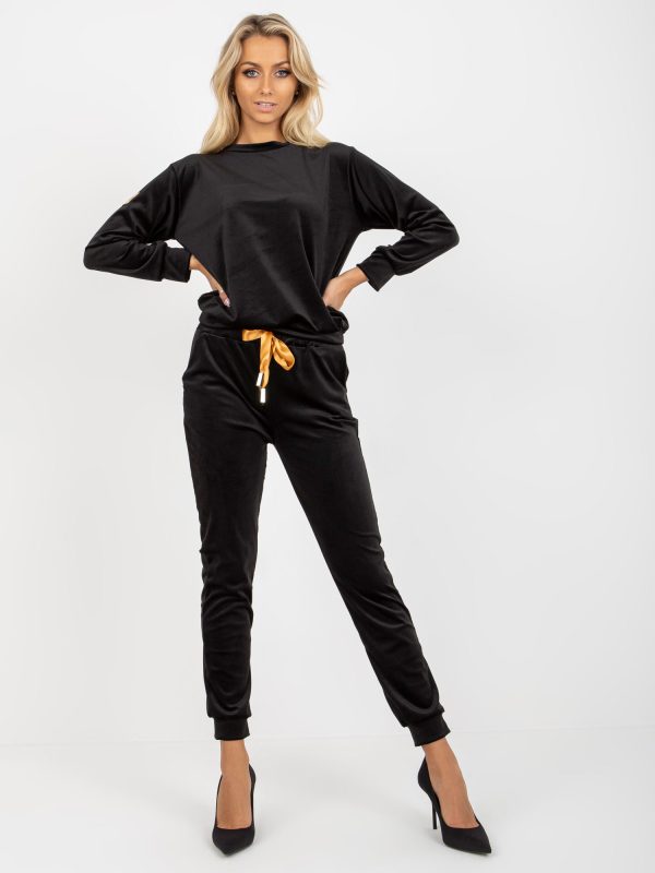 Velkoobchod Černá dámská velurová souprava s vázáním RUE PARIS