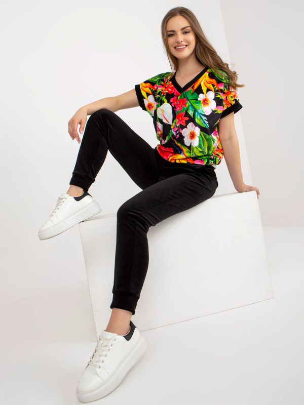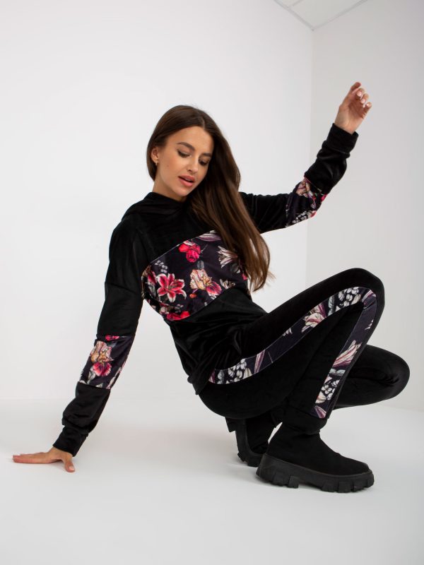 Velkoobchod Černý velurová souprava s květinovou halenkou RUE PARIS